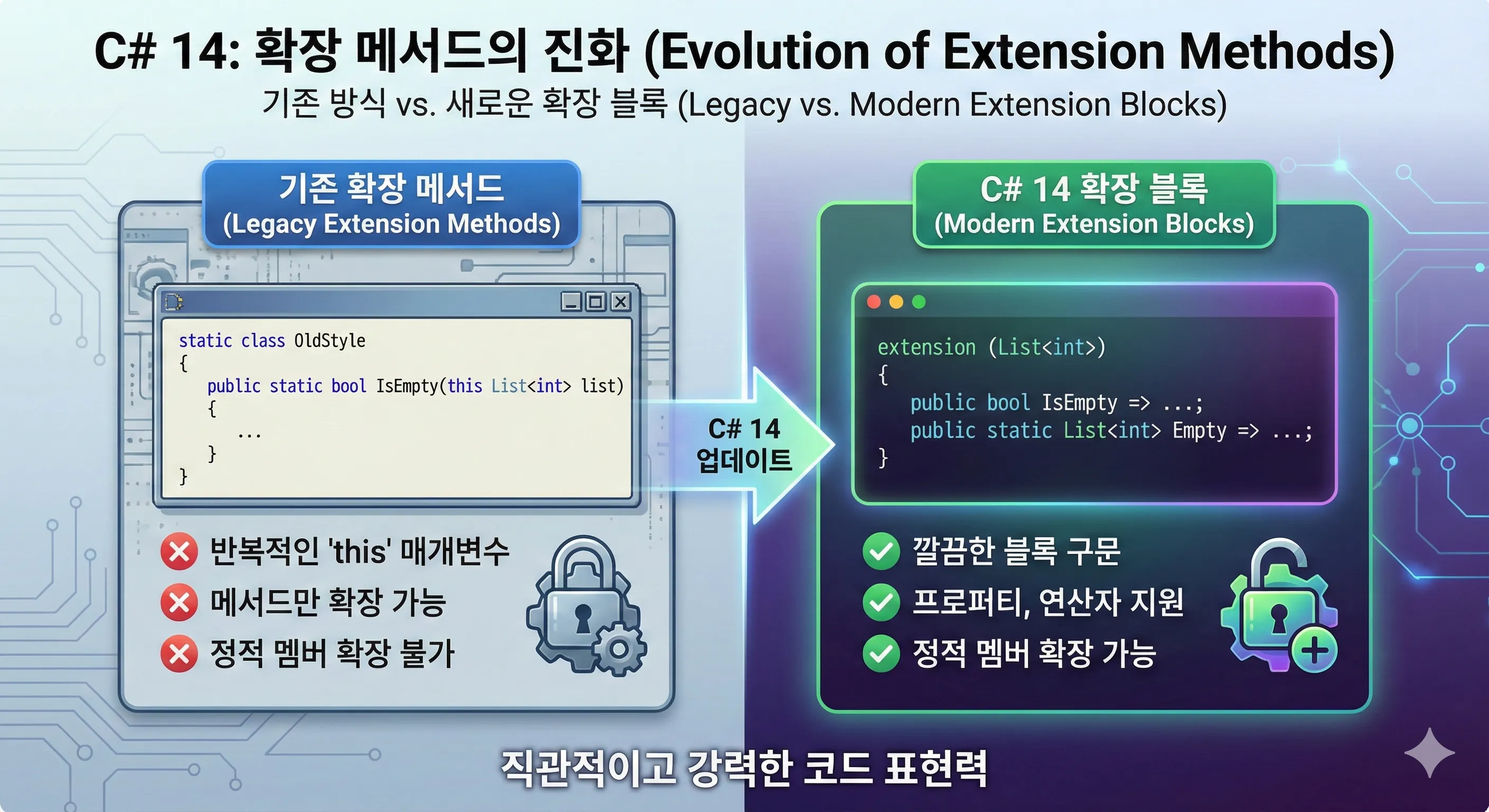 C# 14 확장 블록 완벽 가이드: Extension Blocks로 더 깔끔한 코드 만들기 2026년 02월 21일·4 분 확장메서드 확장블록 C# C#14 .Net10 .Net 프로그래밍언어 클린코드