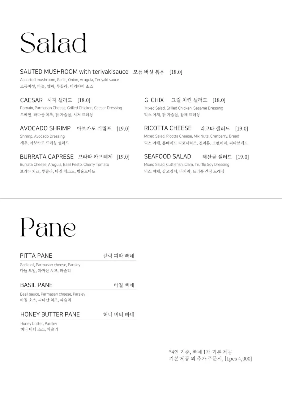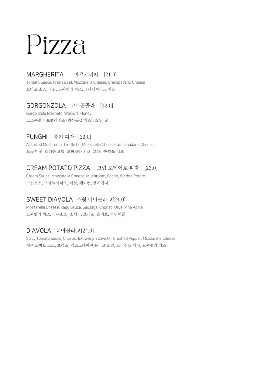 식전 빵에서 느꼈던 그 감동이 피자에서도 이어졌어요. 피자 도우가 식전 빵과 같은 반죽인 것 같더라고요. 쫄깃한 도우 위에 루꼴라와 베이컨이 올라가 있는데, 베이컨이 자칫 느낄 할 수 있는 맛을 딱 잡아줬어요. 간이 너무 세지 않고 적당해서 끝까지 맛있게 먹었네요.