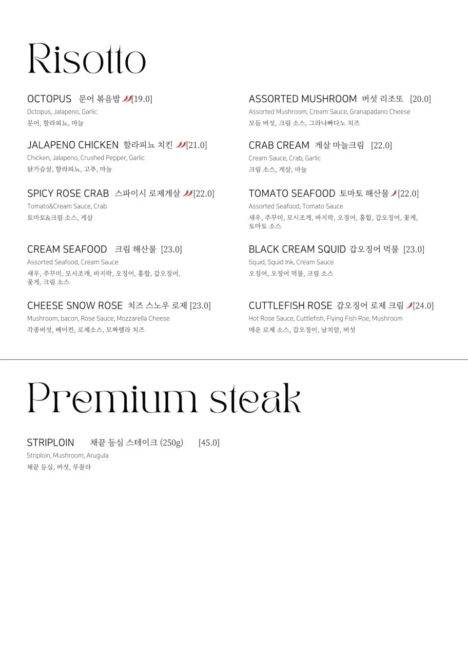 개인적으로 이번 식사에서 가장 놀랐던 메뉴예요. 밥알의 식감이 하나하나 살아있고, 중간중간 날치알이 톡톡 터지는 게 정말 매력적이었거든요. 먹물 리조또 특유의 깊은 맛이 나면서도 전혀 느끼하지 않아 계속 손이 가더라고요. 근래 먹어본 리조또 중 손에 꼽을 정도예요.